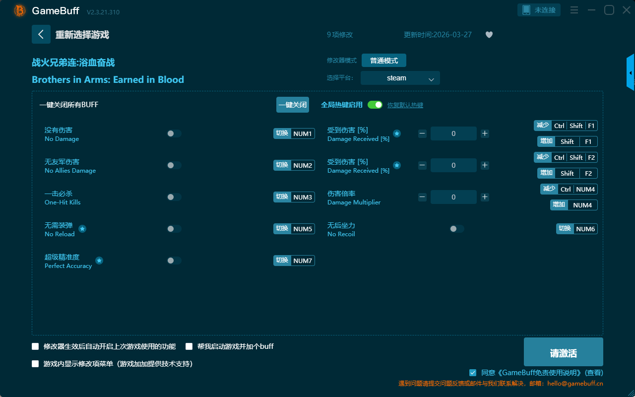 战火兄弟连:浴血奋战九项修改器是一款功能强大的游戏辅助修改器工具,可自由设置拥有没有伤害、无友军伤害、一击必杀、受到伤害、伤害倍率、无后坐力、无需装弹、一击必杀、超级精准度等九项功能内容,沉浸式享受游戏带来的乐趣,大家千万不要错过哦!