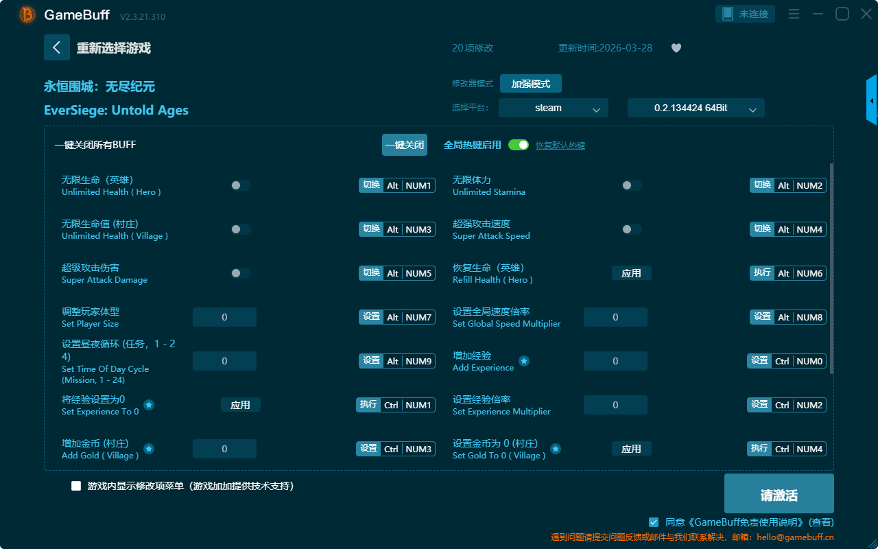 永恒围城:无尽纪元二十项修改器是一款操作极其简单的游戏辅助修改器工具,功能强大实用,根据本身在游戏中遇到的困难自由选择拥有无限生命(英雄)、无限生命值(村庄)、超级攻击伤害、调整玩家体型、设置昼夜循环(任务,1-2、将经验设置为0、增加金币 (村庄)、无限体力、超强攻击速度、恢复生命(英雄)、设置全局速度倍率等二十项功能内容,大家千万不要错过哦!