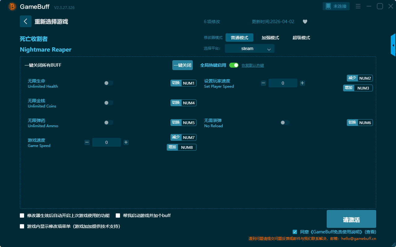 死亡收割者六项修改器是一款操作极其简单的游戏辅助修改器工具,根据本身在游戏中遇到的困难自由选择设置拥有无限生命、无限金钱、无限弹药、游戏速度、设置玩家速度、无需装弹等六项功能内容,轻松享受游戏带来的乐趣,感兴趣的玩家不要错过哦!