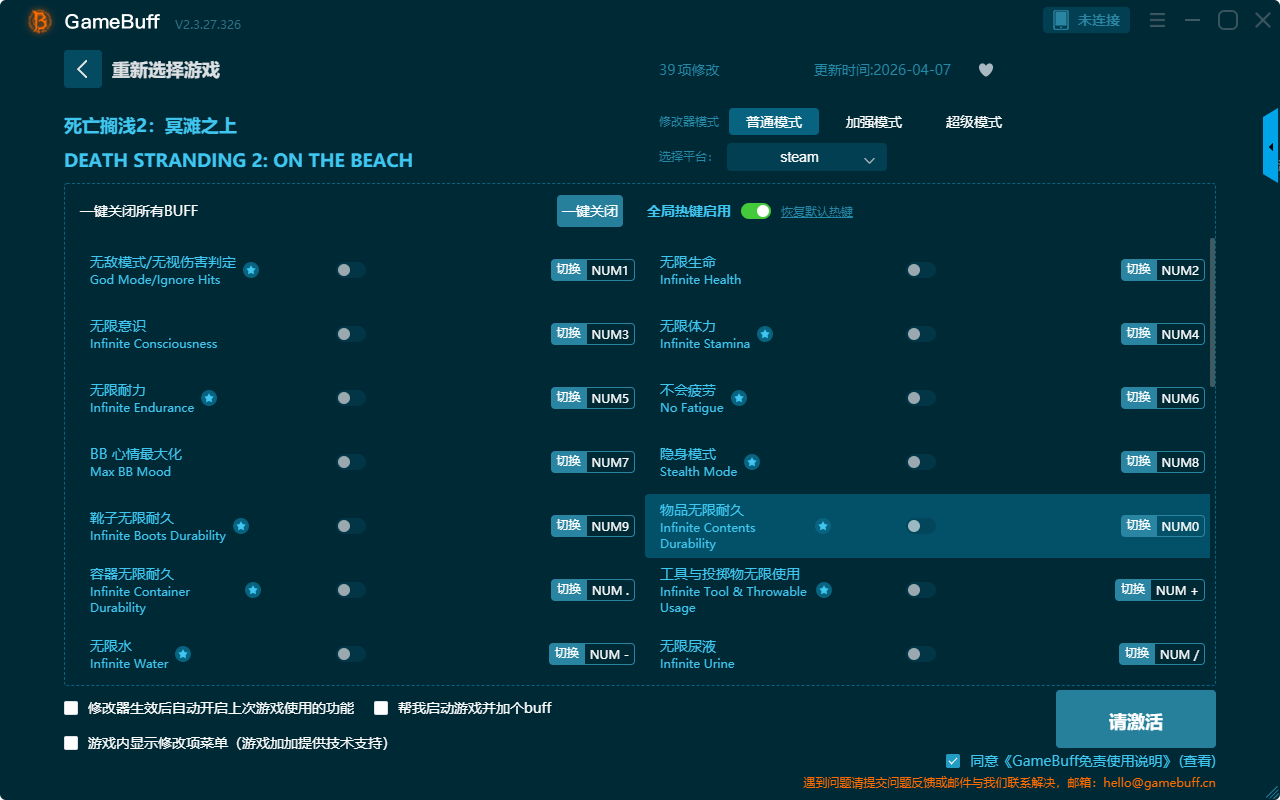 死亡搁浅2:冥滩之上三十九项修改器是一款功能强大实用的游戏辅助修改器工具,操作简单易上手,可以根据本身遇到的困难自由选择拥有无限意识、无限生命、无限体力、隐身模式、无限尿液、无限耐力、无限水、不会疲劳、容器无限耐久、物品无限耐久等三十九项功能内容,大家千万不要错过哦!