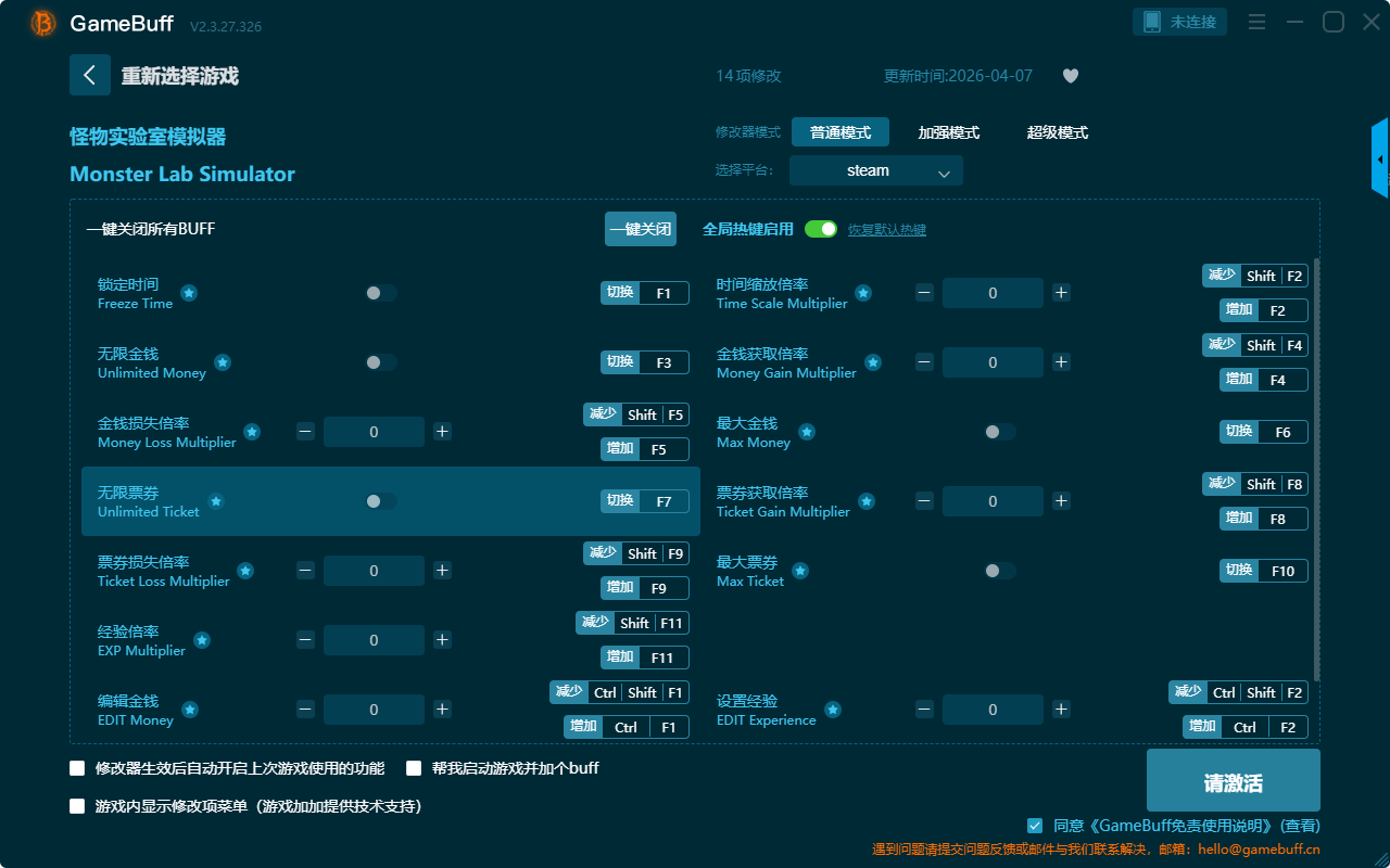 怪物实验室模拟器十四项修改器是一款自由设置拥有锁定时间、无限金钱、金钱损失倍率 、无限票券、票券损失倍率、经验倍率、编辑金钱、时间缩放倍率、金钱获取倍率、最大金钱、票券获取倍率、最大票券、设置经验等十四项功能的游戏辅助修改器工具,感兴趣的朋友不要错过哦!