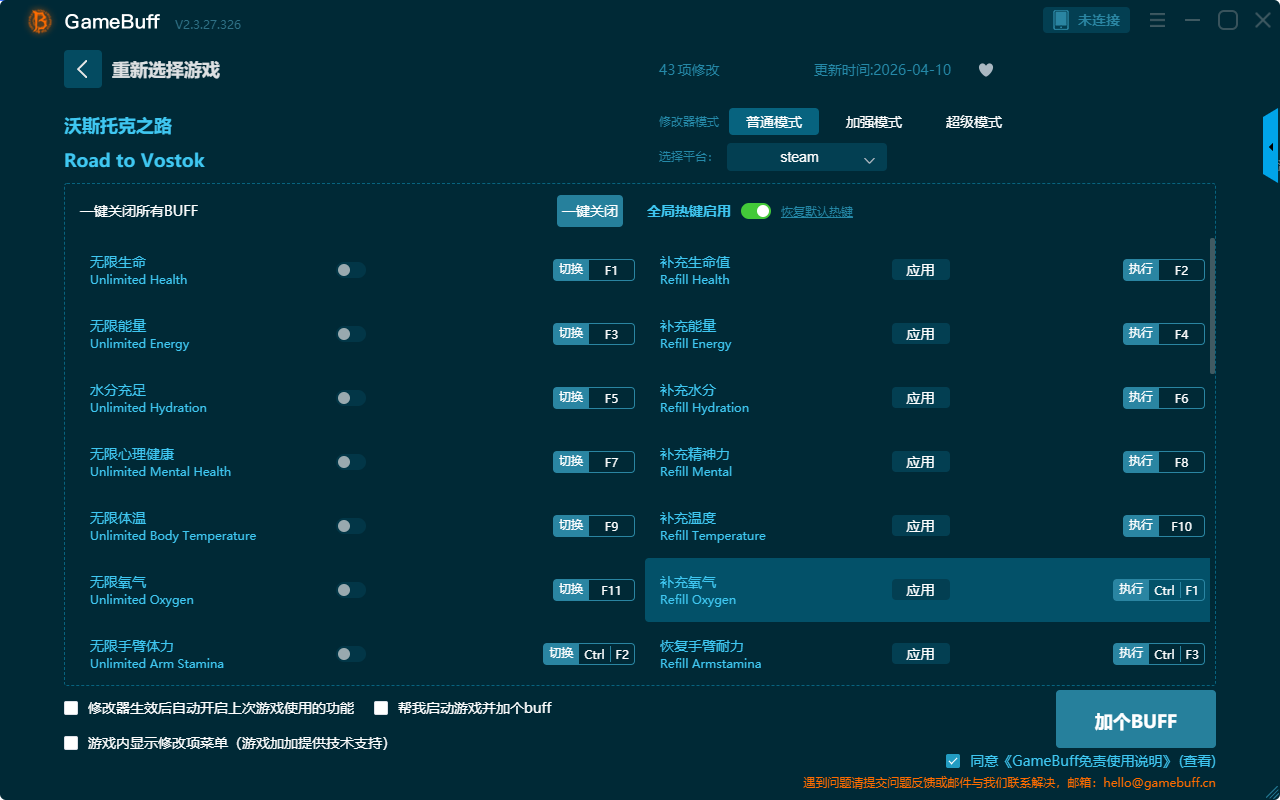 沃斯托克之路四十三项修改器是一款操作极其简单的游戏辅助修改器工具,功能强大实用,可根据本身遇到的困难自由设置拥有无限生命、无限能量、水分充足、无限心理健康、无限体温、无限氧气、无限手臂体力、补充生命值、补充能量、补充水分、补充精神等四十三项功能内容,感兴趣的玩家不要错过哦!