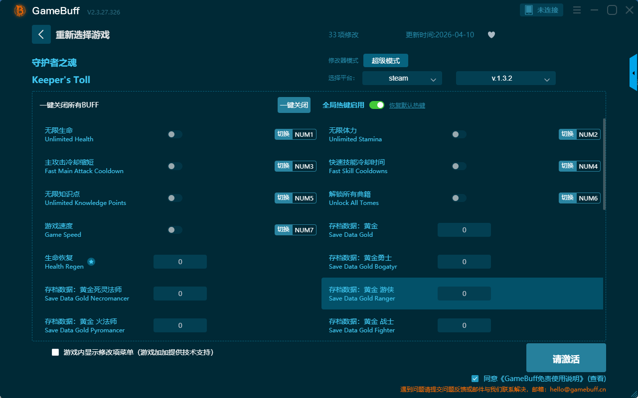 守护者之魂三十三项修改器是一款功能强大的游戏辅助修改器工具,操作简单易上手,玩法自由度极高,将跟随本身遇到的困难自由选择拥有无限生命、主攻击冷却缩短、无限知识点、游戏速度、生命恢复、存档数据:黄金死灵法师、存档数据:黄金火法师、无限体力、快速技能冷却时间、解锁所有典籍、存档数据:黄金、存档数据:黄金勇士、存档数据:黄金游侠等三十三项功能内容,大家千万不要错过哦!