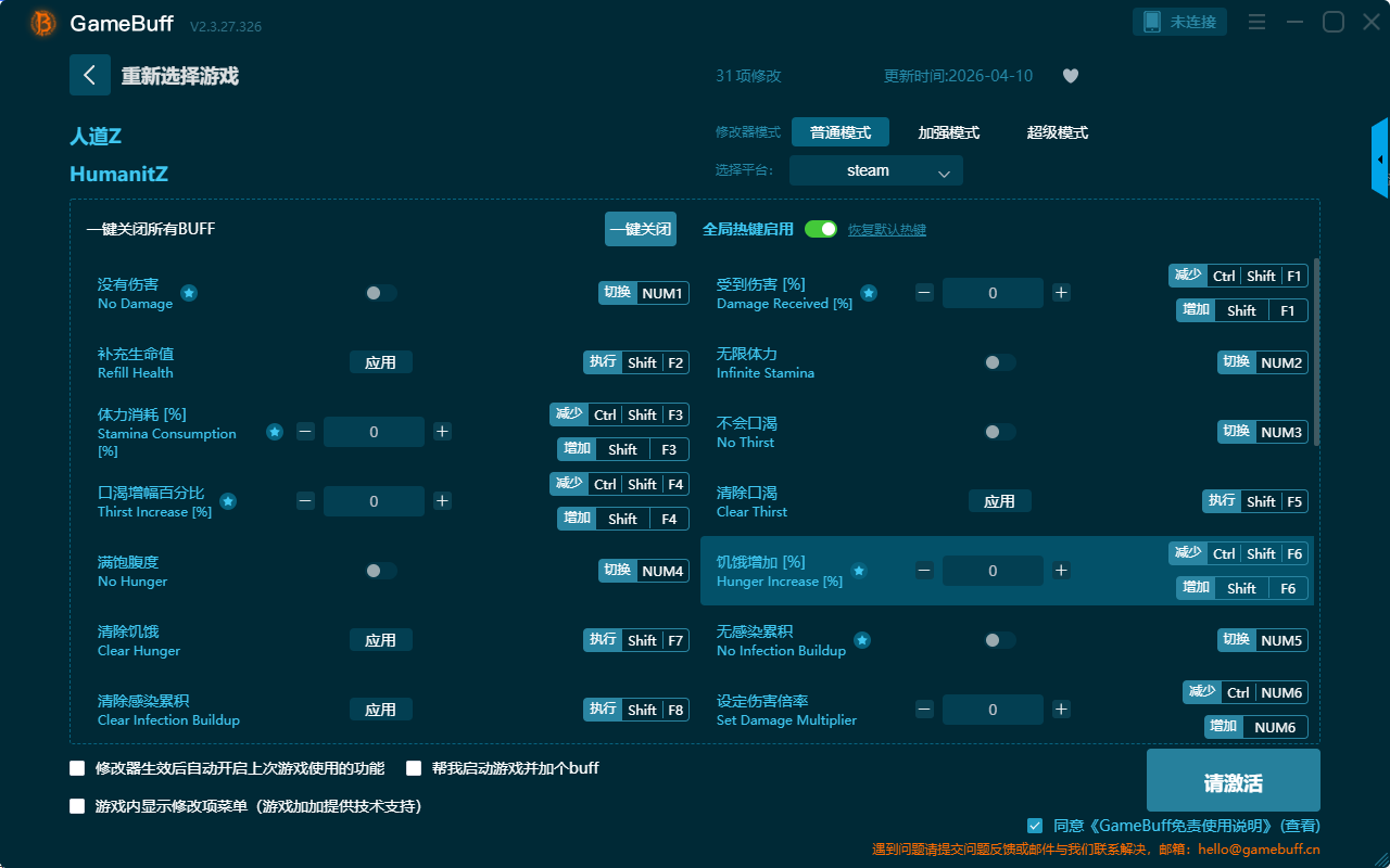 人道Z三十一项修改器是一款操作极其简单的游戏辅助修改器工具,功能强大实用,根据本身遇到的困难一键选择拥有没有伤害、补充生命值、体力消耗[%]、口渴增幅百分比、满饱腹度、清除饥饿、清除感染累积、受到伤害[%]、无限体力、不会口渴、清除口渴、饥饿增加[%]、无感染累积等三十一项功能内容,大家千万不要错过哦!
