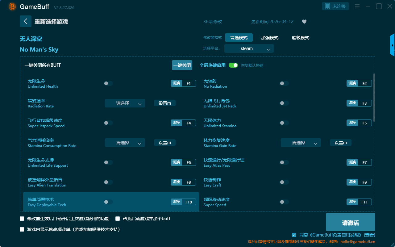 无人深空三十六项修改器是一款功能强大的游戏辅助修改器工具,根据在游戏中遇到的困难自由选择拥有无限生命、无辐射、无限飞行背包、无限体力、飞行背后超级速度、无限生命支持、简单部署技术、超级移动速度、快速制作、快速通行、无限通行等三十六项功能内容,感兴趣的玩家千万不要错过哦!