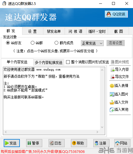 1.发送对象精准,速达QQ群发器为了满足广大用户的需要,在功能上做了进一步的完善,支持禁发名单,支持只发送展开的分组,可以把你不想发送消息的好友列入一个分组,不展开这个分组就不发送。