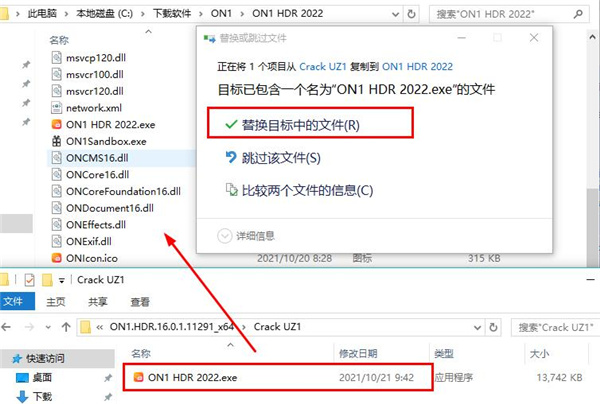 6、然后将ON1 HDR 2022.exe移动到软件根目录下,复制和替换原文件;