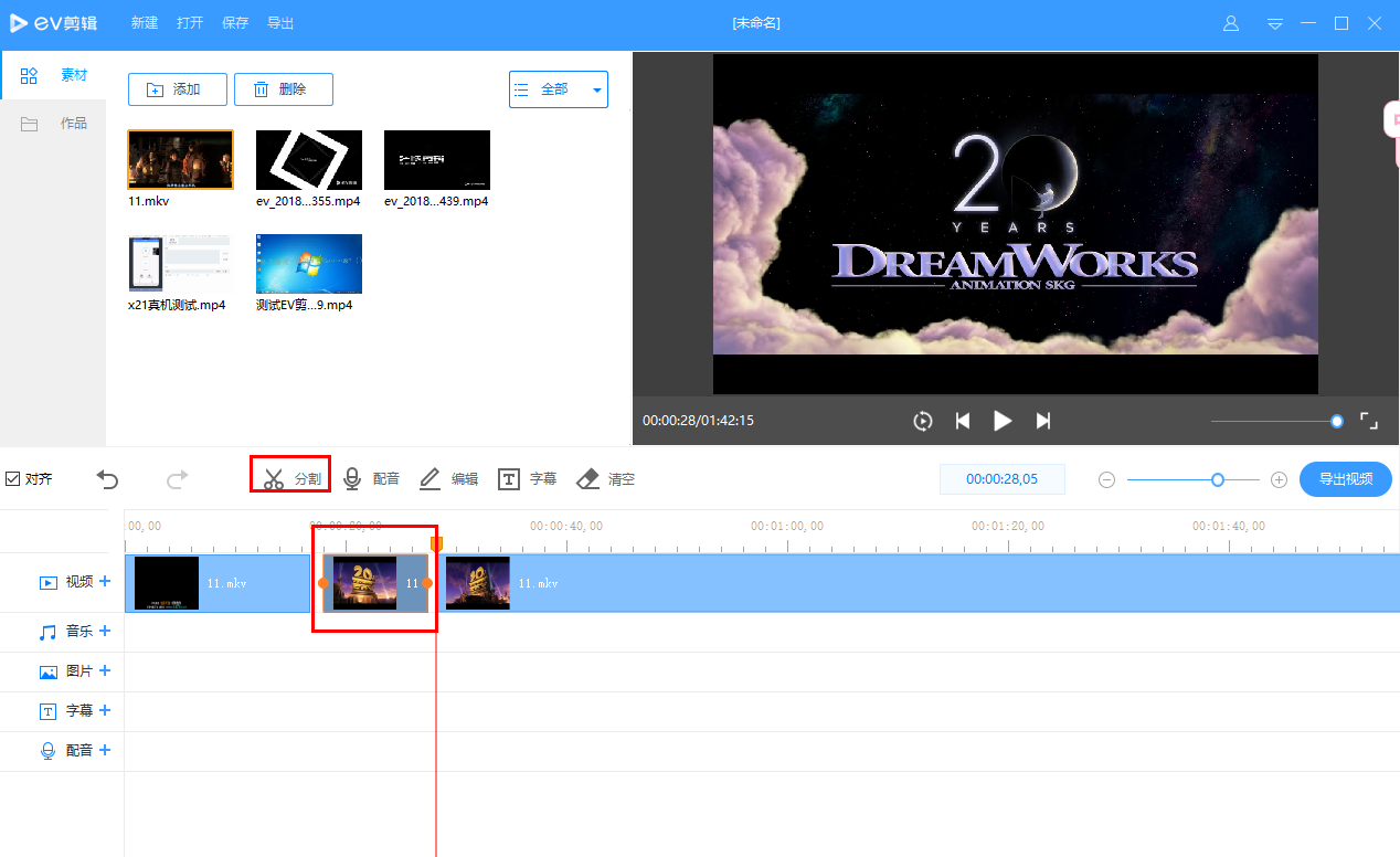 2.按照需求将视频依次拖动到轨道上,使用分割工具将不需要的部分剪切掉。注:分割工具只起到将视频分割开来的作用,分割以后自行选中不需要的部分单击右键删除。