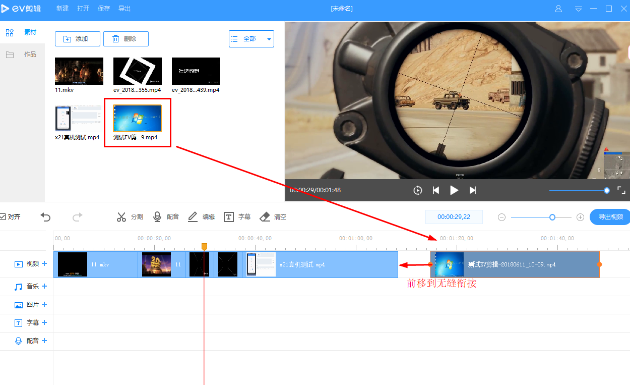 3.将后面的视频依次拖动到轨道上,直到视频轨道上没有任何空隙的部分,从头播放无误以后,点击导出视频即可。