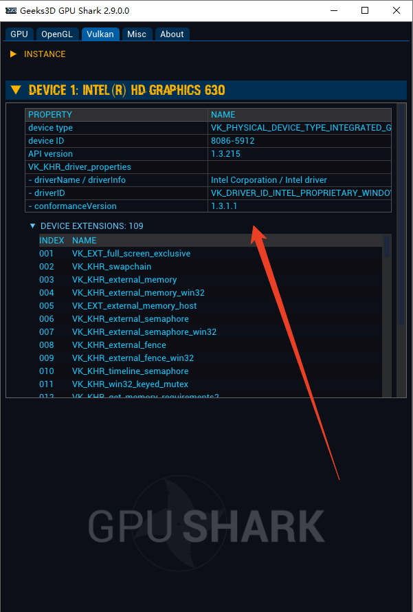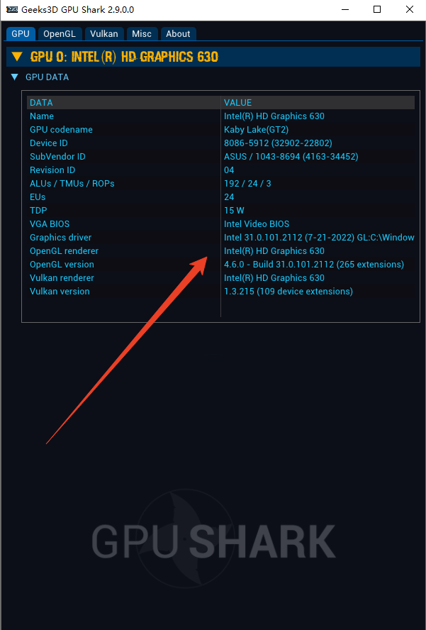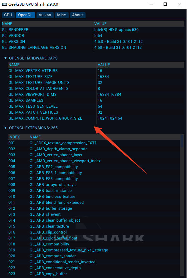 2、第二个标签页为 OpenGL,提供各类接口信息,适合专业人士查看,多数使用者可能难以理解这些内容。