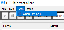 1、打开 Liii BitTorrent Client 软件,在顶部菜单栏中找到 “Tool”(工具)选项,点击后在下拉菜单中选择 “open Settings”(打开设置)。、