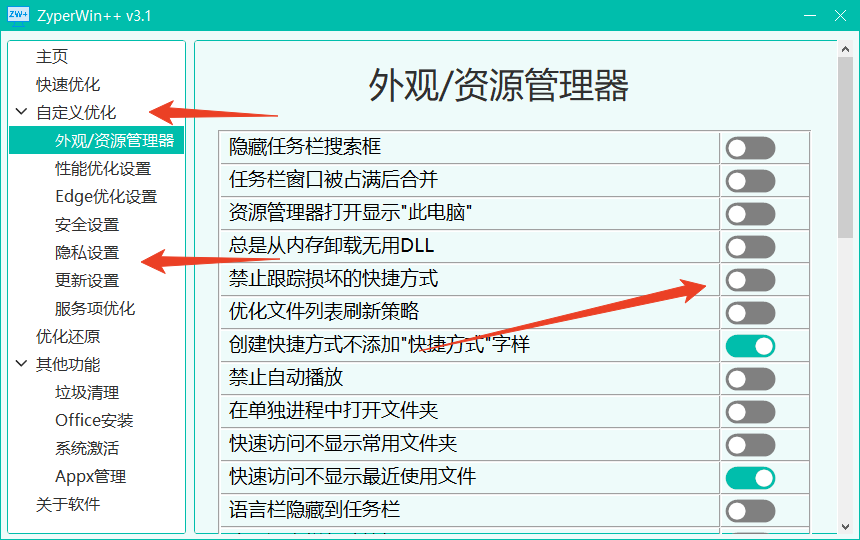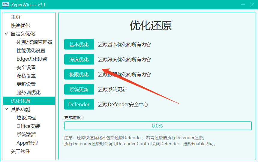 1、ZyperWin 无需安装,打开即可使用,包含快速优化、自定义优化、优化还原及其他功能四个模块;