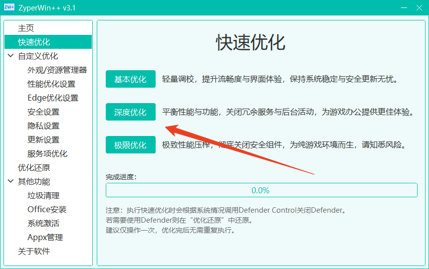 包含基本模式、深度模式、极限模式三种优化方案,分别适配办公环境、游戏场景、专业用途,按需选择即可启动优化。