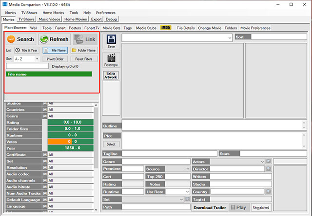 1、打开 Media Companion 电脑版,进入主界面后可看到功能菜单区域,在此处点击对应选项即可添加视频文件。