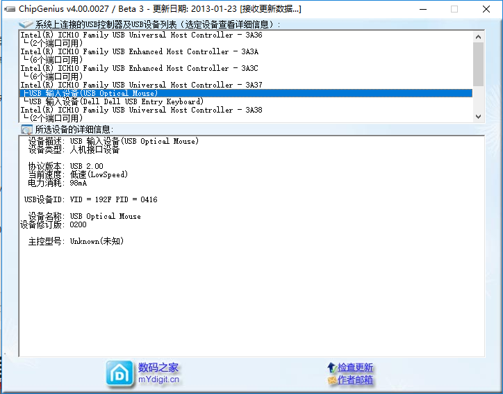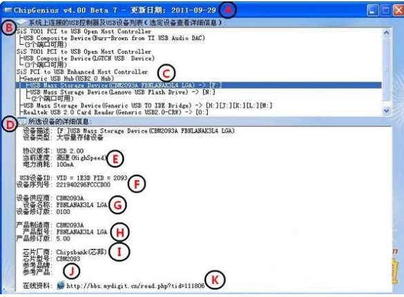 K:展示检测出的 USB 设备或主控匹配资料,以及工具软件下载链接,点击前方地球图标可直接打开。