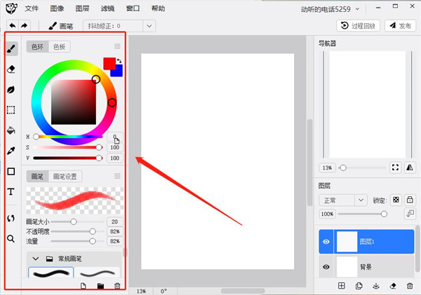 9、选中所需绘制工具后,在中间空白画布区域即可开始绘制图像,根据创作需求调整笔触与颜色。
