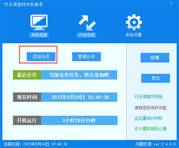 1、打开行云海定时关机助手,进入主系统界面后,点击页面上方的 “添加任务” 按钮。
