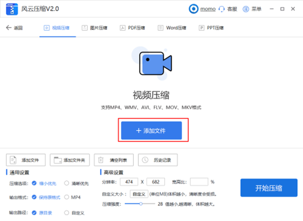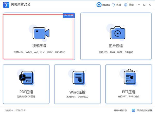 1、打开风云压缩软件,选择视频压缩功能。软件包含视频压缩、图片压缩、PDF 文件压缩、Word 压缩、PPT 压缩五大功能,基本覆盖各类压缩需求,支持批量压缩、一键压缩、批量拖拽添加等便捷操作,有效提升效率。