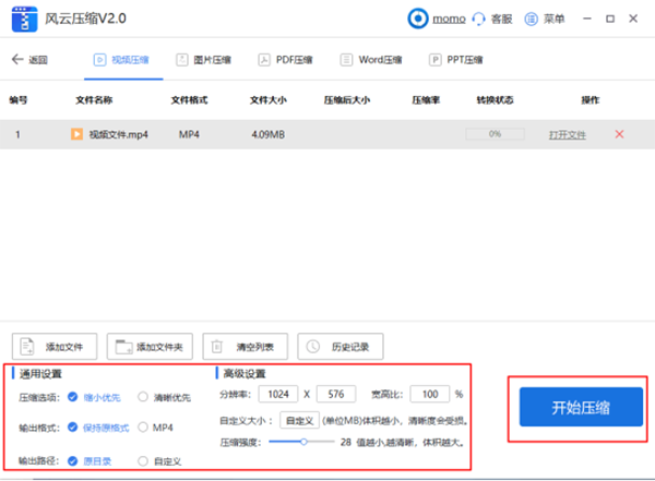 3、对压缩设置进行调整,选择输出路径、输出格式及压缩选项等,所有设置完成后点击开始压缩即可。
