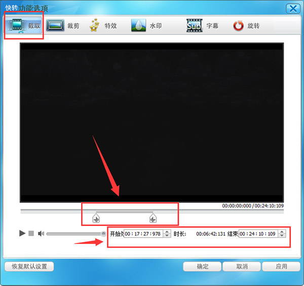 3、在 “截取” 窗口中,可拖动进度条上的两个按钮选取视频片段,也能点击播放进行试听,截取满意后点击确定。