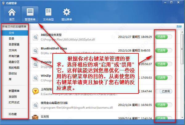 7、点击“管理菜单”,选择相应的项“启用”或“禁用”,这样就能优化没用的右键菜单,让右键菜单清爽且提升反应速度。