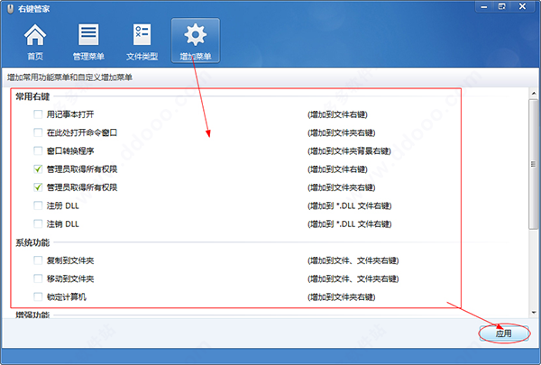 9、右键管家还提供右键菜单添加功能,可通过选择并勾选相应的项,将常用选项添加到右键菜单中。