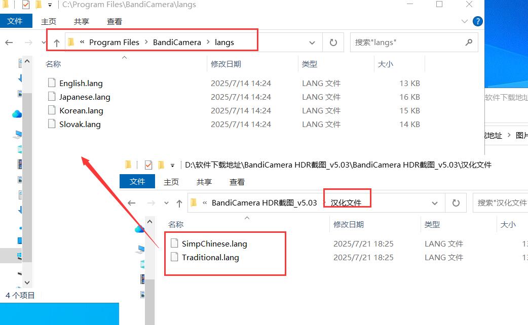 4、提取软件包内汉化文件内容,粘贴至安装目录bandicamera/langs