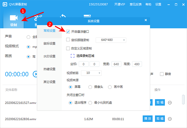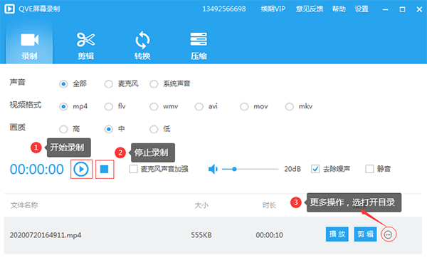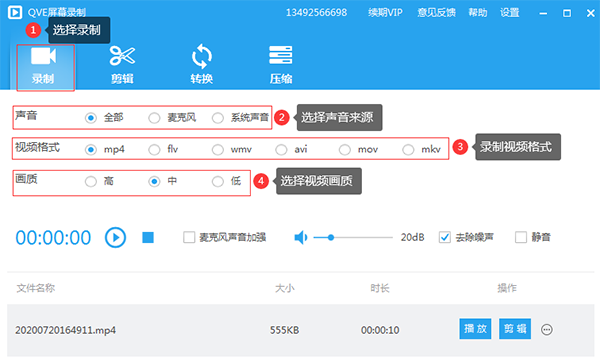 打开QVE屏幕录制软件,主界面选择【录制】,声音来源默认选【全部】,视频格式默认mp4,录制画质默认中等。