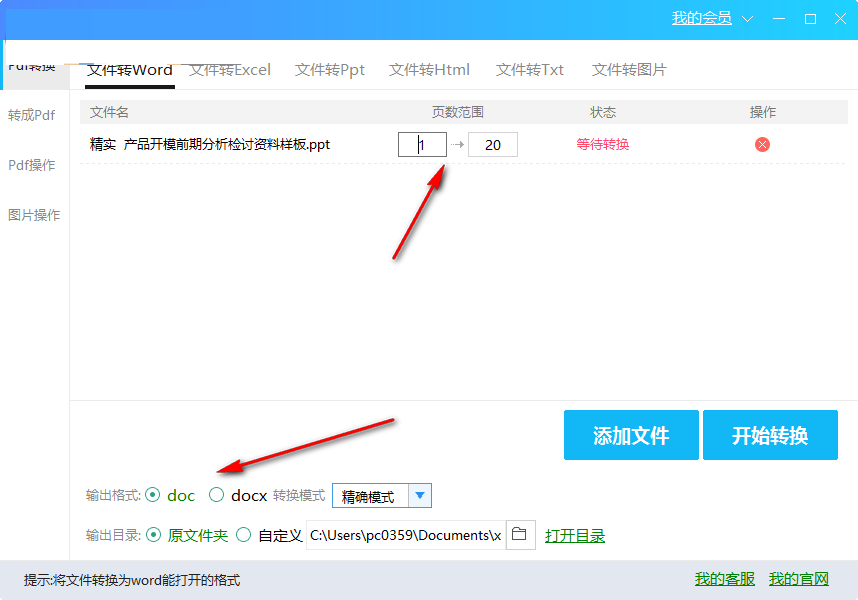 4、自动读取文件页数,选择doc等所需输出格式。
