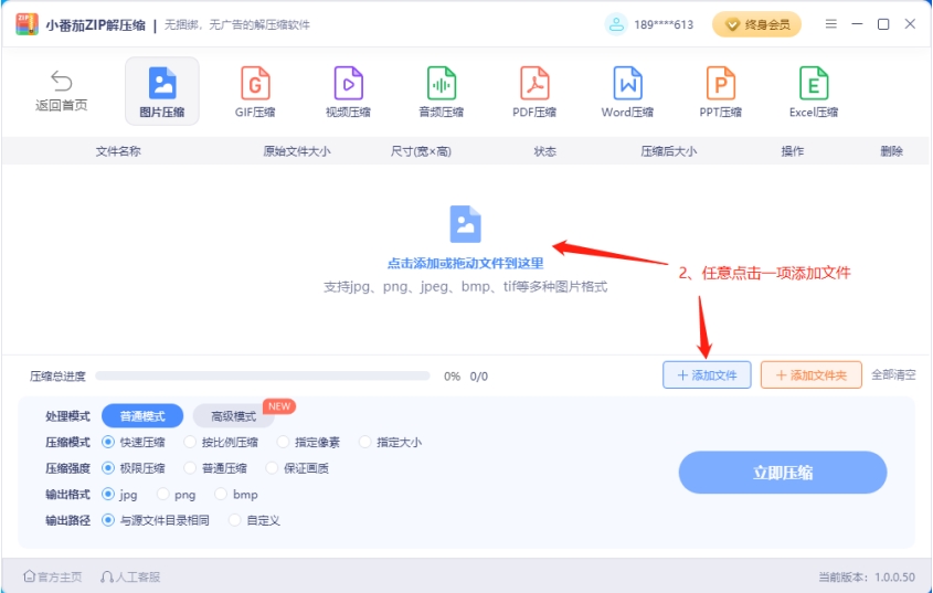 2、点击“添加文件”或“添加文件夹”,也可点击中心图标或拖拽添加图片;