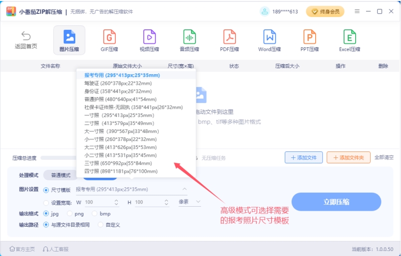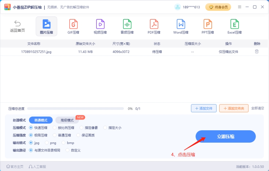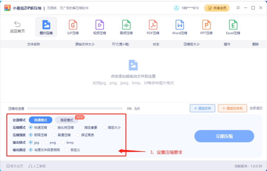 3、左下方根据需求选择压缩模式、压缩强度和输出格式;