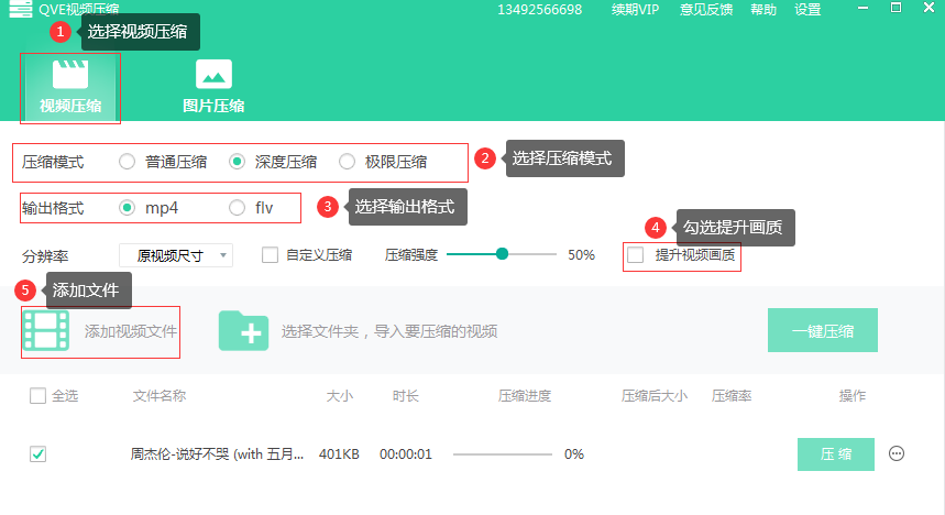 1、打开安装好的QVE视频压缩软件,主界面选择【视频压缩】菜单,挑选压缩模式;软件默认普通压缩,压缩强度越大,输出文件体积越小;