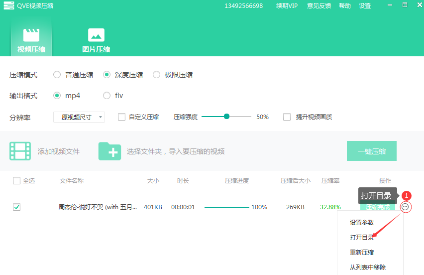 2、添加文件成功后,列表会显示文件大小、时长,点击【压缩】按钮,等待进度达到100%,文件即导出至本地;点击更多操作按钮,选择打开目录即可查看。