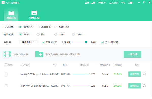 2、选定压缩模式后点击压缩即可完成,添加多视频可一键批量压缩;