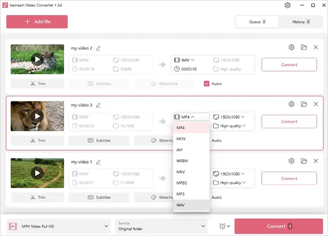 1、批量转换:添加多个文件至转换队列,一键批量更改格式,可统一应用输出设置;