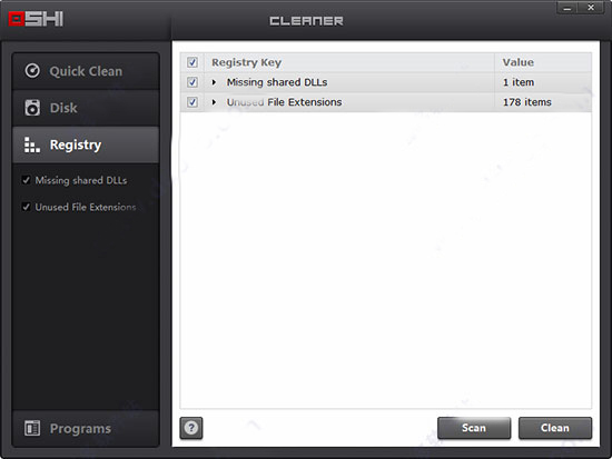 4、精准注册表清理:清理失效、无用的注册表项,可分析缺少的共享DLL、未使用的文件扩展名;