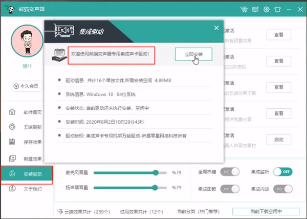 1、在本站下载软件包并解压,双击应用程序启动安装;安装完成后打开熊猫变声器,首先完成专用集成声卡驱动的安装;
