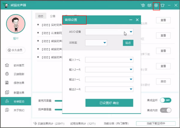 2、驱动安装完毕,点击右上角设置按钮,选择ASIO设置,根据已安装的声卡驱动选择对应下拉设备;