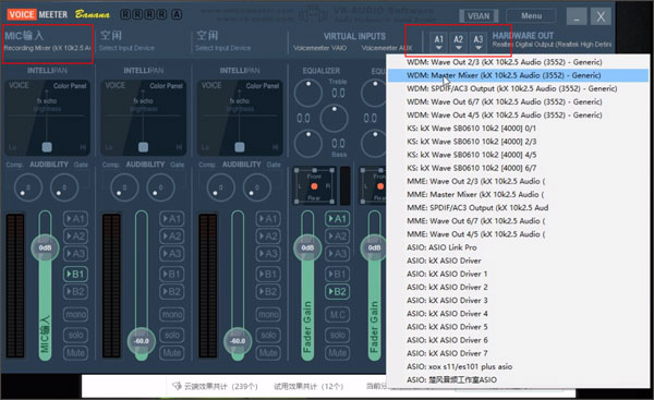 3、开启右下方“集成面板”,选择MIC输入设备以及右侧A1设备;