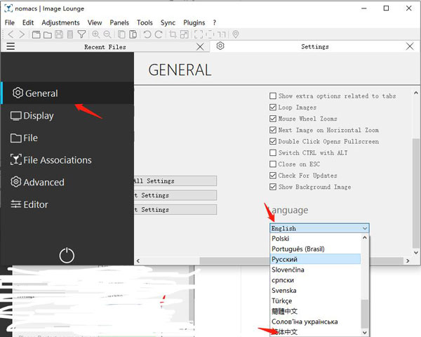 5、在“General”选项中找到“Language”设置,选择简体中文;