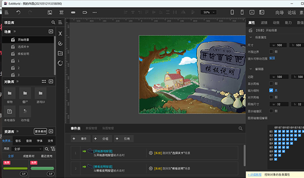 3、打开素材后,按照常规操作流程为素材添加对应属性、设置事件等,完成基础制作。