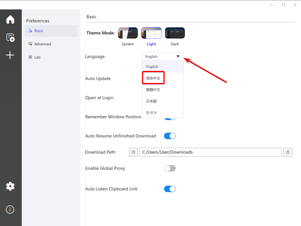 2、在 Basic—>Language 右侧的下拉菜单中,选择简体中文选项。