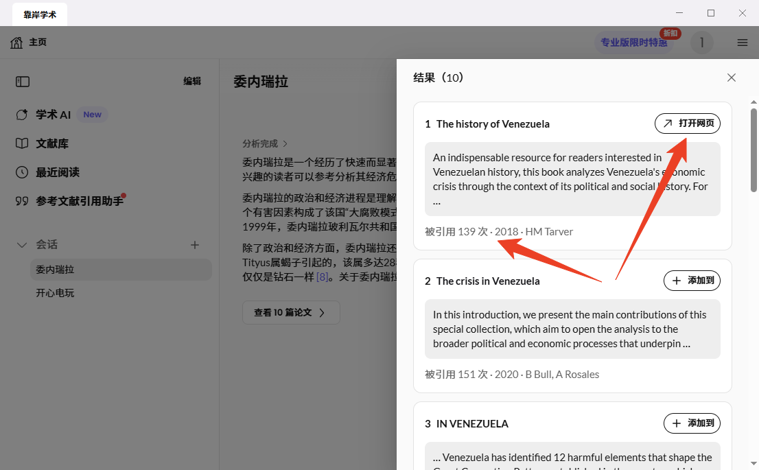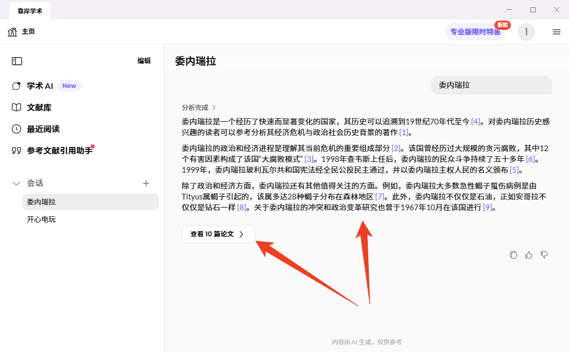 6、输入特定主题如委内瑞拉,将生成合理分析内容,同时匹配推荐10篇相关论文。