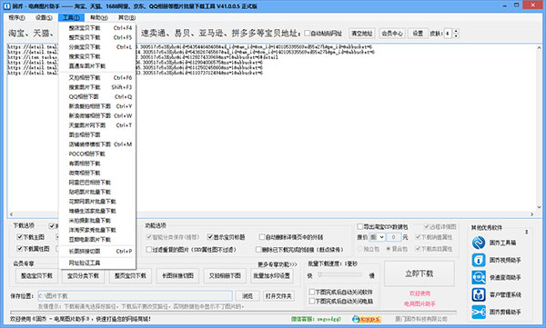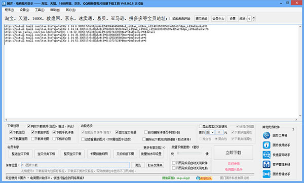 1、主流电商宝贝一键下载:支持淘宝、天猫、京东等数十家国内外主流商城商品批量下载,自动按主图、属性图、描述图分类保存。
