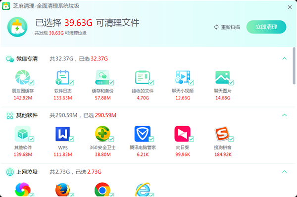 2、运行芝麻清理软件,直接点击主界面 “立即扫描” 按钮,稍作等待即可查看检测结果。