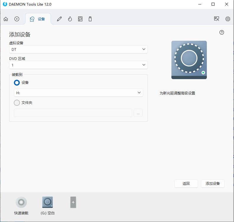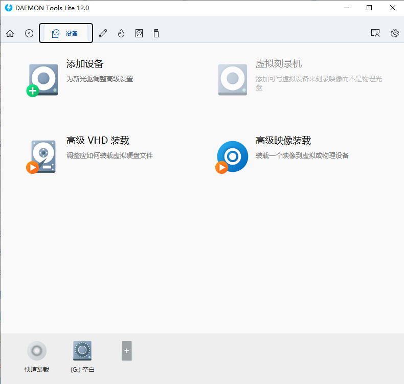 3、进入【设备】界面,支持添加设备、虚拟刻录机、VHD装载等多项功能;