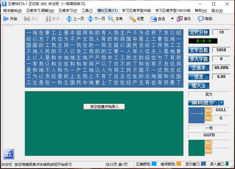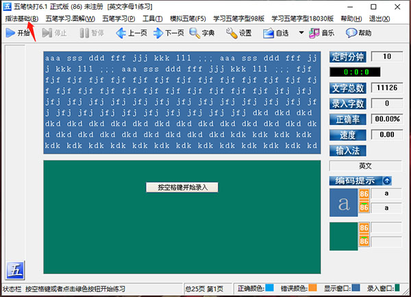 3、综合练习模式:提供英文指法、五笔字根、单字等多样化的练习形式。