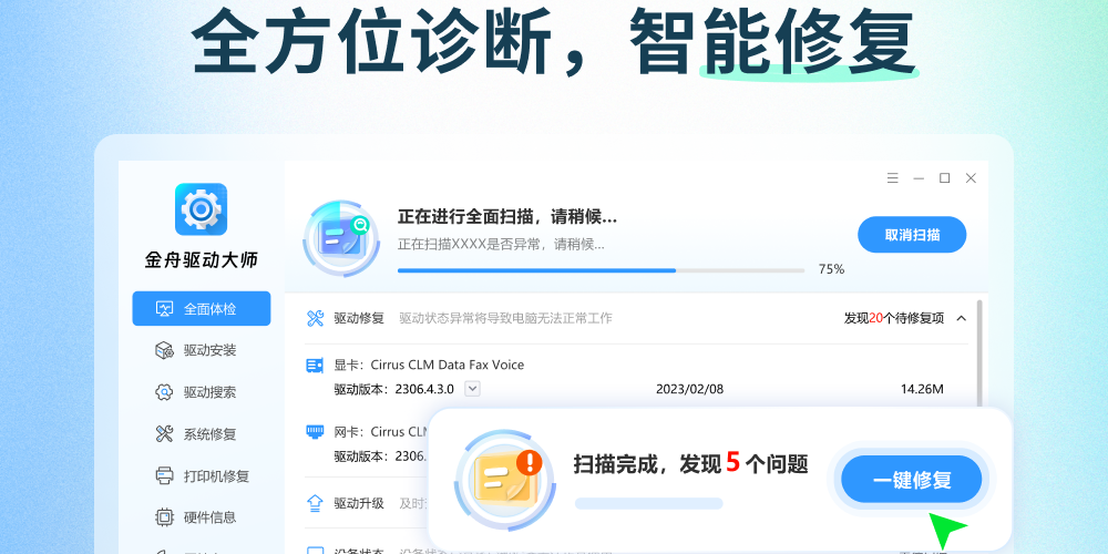 5、通过全面体检功能快速扫描驱动问题,驱动搜索可精准匹配所需驱动。