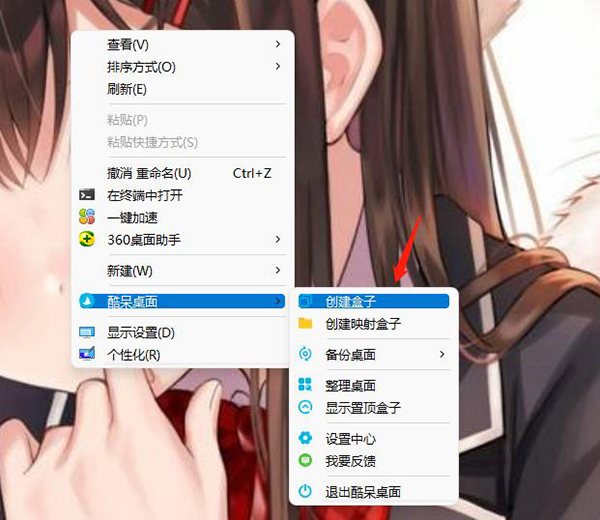 4、新建盒子:在桌面任意位置点击鼠标右键,找到酷呆桌面选项并选择创建盒子。
