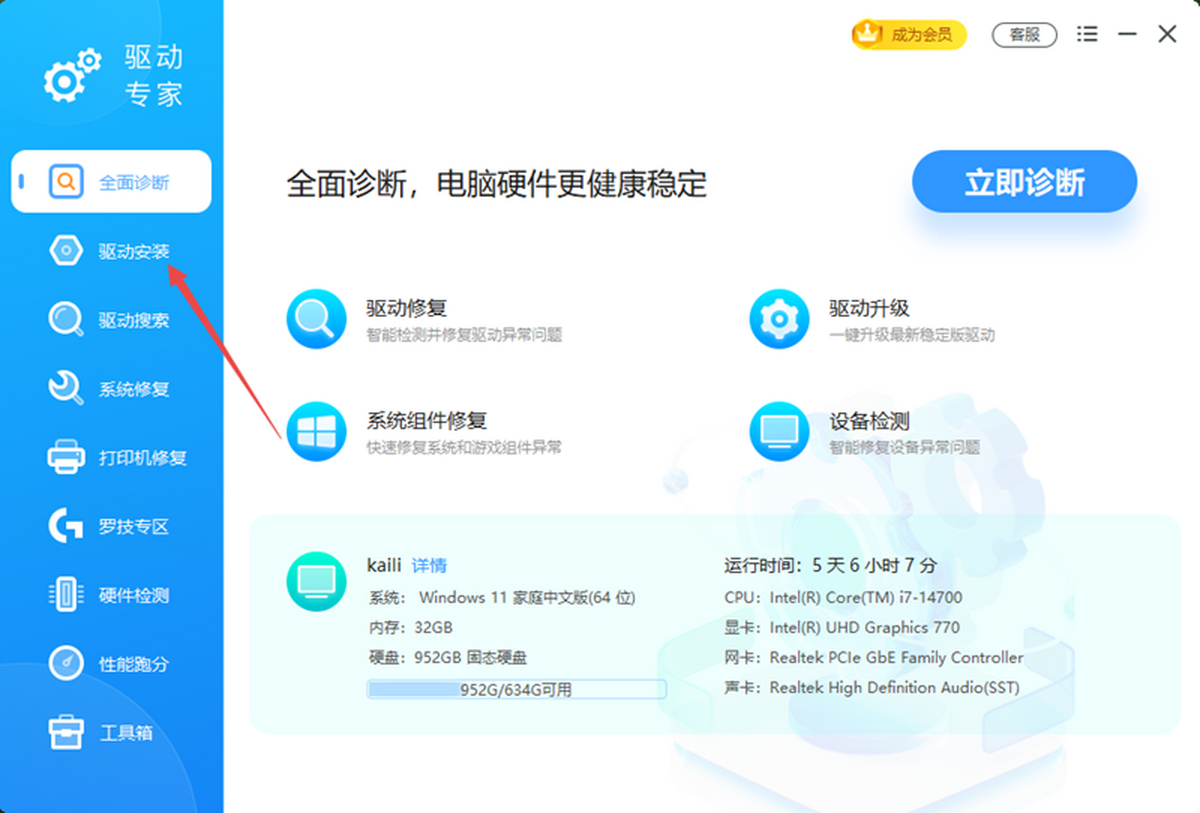 1、启动软件,点击主界面左侧的驱动安装功能。